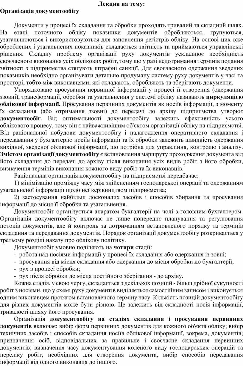 Документи у процесі їх складання та обробки проходять тривалий та складний шлях. На етапі поточного обліку показники документів обробляються, групуються, узагальнюються і використовуються для заповнення регістрів обліку. На основі цих вже оброблених і узагальнених показників складається звітність та приймаються управлінські рішення. Складну проблему організації руху документів ускладнює необхідність своєчасного виконання усіх облікових робіт, тому що у разі недотримання термінів подання звітності з підприємства стягують штрафні санкції, Для своєчасного одержання зведених показників необхідно організувати детально продуману систему руху документів у часі та просторі, тобто між виконавцями, які складають, обробляють та зберігають документи.