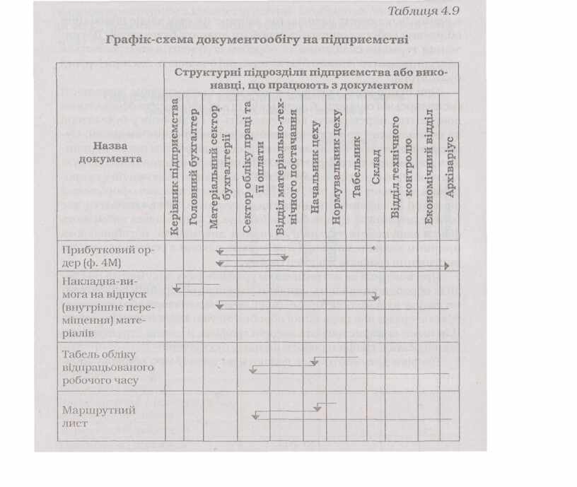Для обґрунтування та деталізації зведених графіків, пошуку усіх резервів прискорення облікового процесу розробляються індивідуальні схеми руху документів. У таких схемах у технологічній послідовності створення і використання первинного документу вказують усі види робіт, що виконуються з цим документом від початку його складання до здачі до архіву; час за кожним етапом роботи і час у днях з моменту початку складання; місця роботи з документом та посадових осіб, які беруть участь в його складанні та обробці.