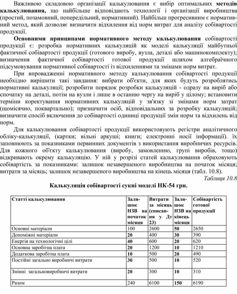 Для калькулювання собівартості продукції використовують регістри аналітичного обліку-калькуляції, (картки; вільні аркуші; книги; електронні носії інформації). їх заповнюють за показниками первинних документів з використання виробничих ресурсів. Для кожного об'єкту калькулювання (виробу, замовленню, групі виробів, тощо) відкривають окрему калькуляцію. У ній у розрізі статей калькулювання обраховують собівартість за показниками: залишок незавершеного виробництва на початок місяця; витрати за місяць; залишок незавершеного виробництва на кінець місяця (табл. 10.8).