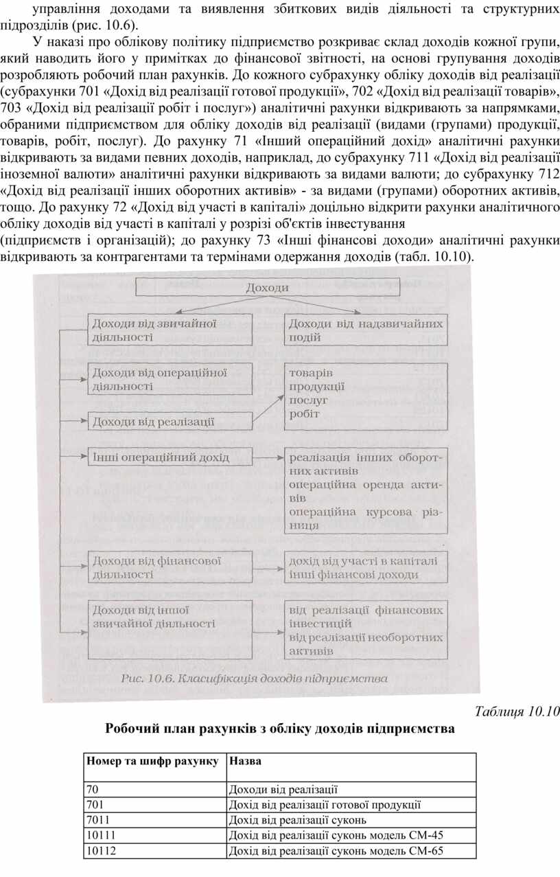 Дохід підприємства формується з доходів, одержаних від різних видів його діяльності та доходів структурних підрозділів, тому облік доходів необхідно організувати як за видами діяльності, так і структурними підрозділами, а всередині них - за видами продукції, робіт та послуг. Лише така ієрархічна побудова підсистеми обліку дозволить забезпечити управління доходами та виявлення збиткових видів діяльності та структурних підрозділів (рис. 10.6).