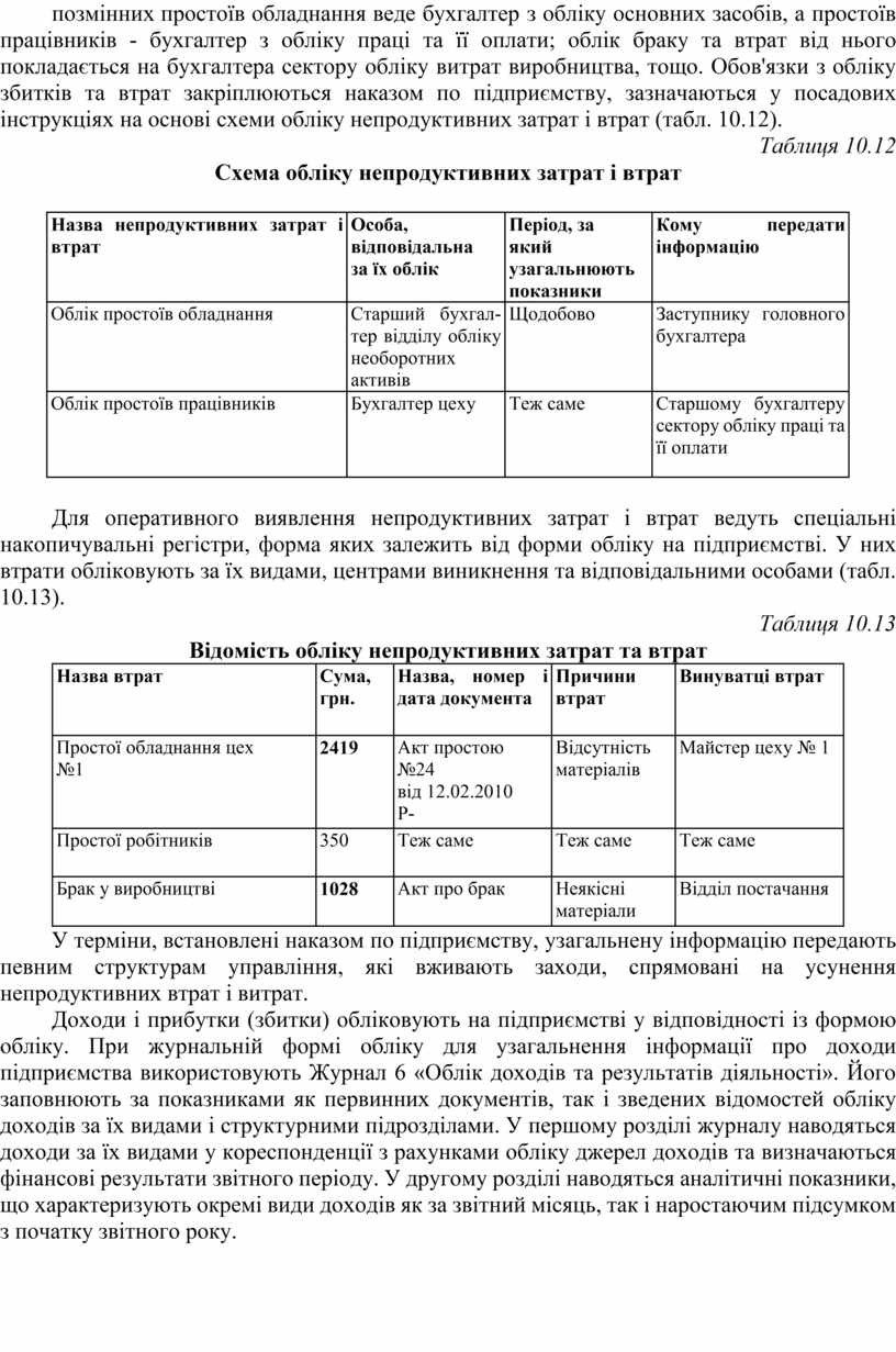 Для оперативного виявлення непродуктивних затрат і втрат ведуть спеціальні накопичувальні регістри, форма яких залежить від форми обліку на підприємстві. У них втрати обліковують за їх видами, центрами виникнення та відповідальними особами (табл. 10.13).