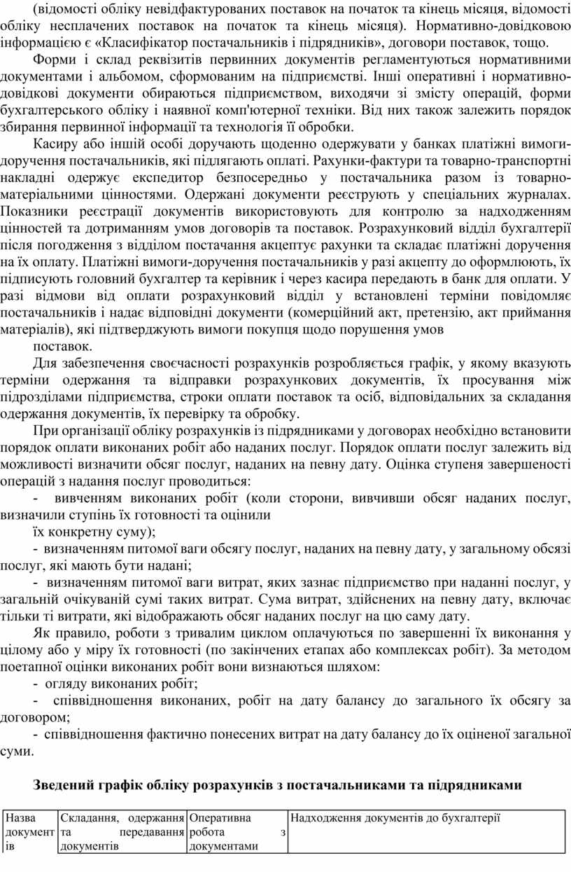 Виконані роботи або надані послуги оформлюються Довідками виконаних робіт або Актами виконаних робіт. Після їх підписання відповідальними особами як виконавця, так і замовника, вони передаються у розрахунковий відділ бухгалтерії для оплати. Облік розрахунків з постачальниками ведеться матеріальним відділом бухгалтерії при обліку запасів, а з підрядниками - відділом капітального будівництва або ремонтно-будівельним відділом.