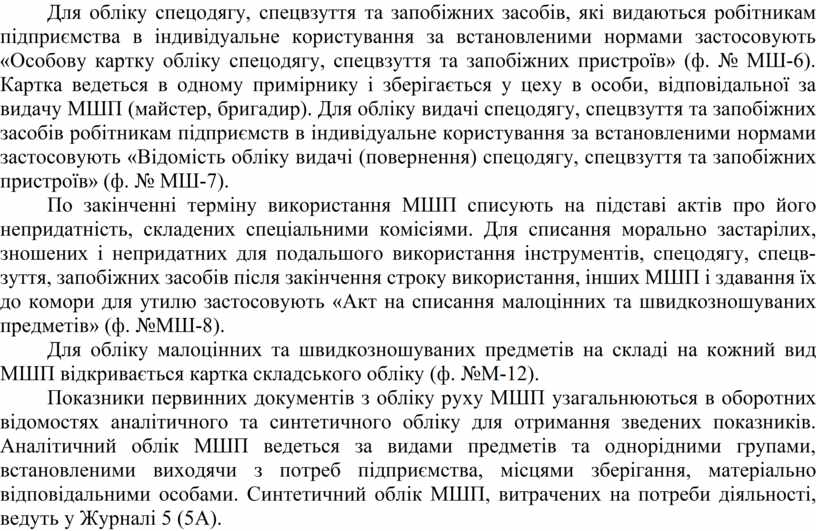 Для обліку спецодягу, спецвзуття та запобіжних засобів, які видаються робітникам підприємства в індивідуальне користування за встановленими нормами застосовують «Особову картку обліку спецодягу, спецвзуття та запобіжних пристроїв» (ф. № МШ-6). Картка ведеться в одному примірнику і зберігається у цеху в особи, відповідальної за видачу МШП (майстер, бригадир). Для обліку видачі спецодягу, спецвзуття та запобіжних засобів робітникам підприємств в індивідуальне користування за встановленими нормами застосовують «Відомість обліку видачі (повернення) спецодягу, спецвзуття та запобіжних пристроїв» (ф. № МШ-7).