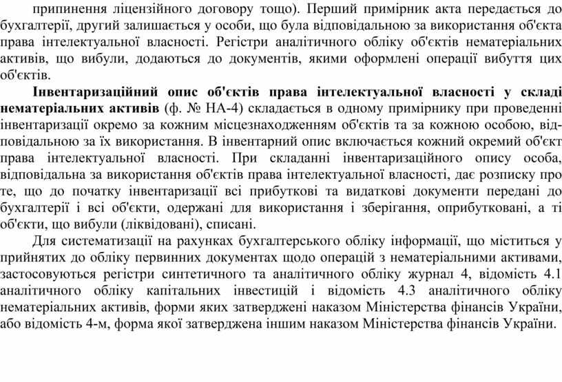 Вибуття об'єкта права інтелектуальної власності в інвентарній картці відмічають на підставі Акту вибуття (ліквідації) об'єкта права інтелектуальної власності у складі нематеріальних активів (ф. № НА-3). Акт складається комісією у двох примірниках на кожний окремий об'єкт нематеріальних активів. У ньому зазначаються причини вибуття (закінчення строку дії: майнових прав інтелектуальної власності, договору на використання майнових прав інтелектуальної власності, зберігання інформації щодо об'єктів права інтелектуальної власності як комерційної таємниці, ліцензійного договору; дострокове припинення ліцензійного договору тощо). Перший примірник акта передається до бухгалтерії, другий залишається у особи, що була відповідальною за використання об'єкта права інтелектуальної власності. Регістри аналітичного обліку об'єктів нематеріальних активів, що вибули, додаються до документів, якими оформлені операції вибуття цих об'єктів.