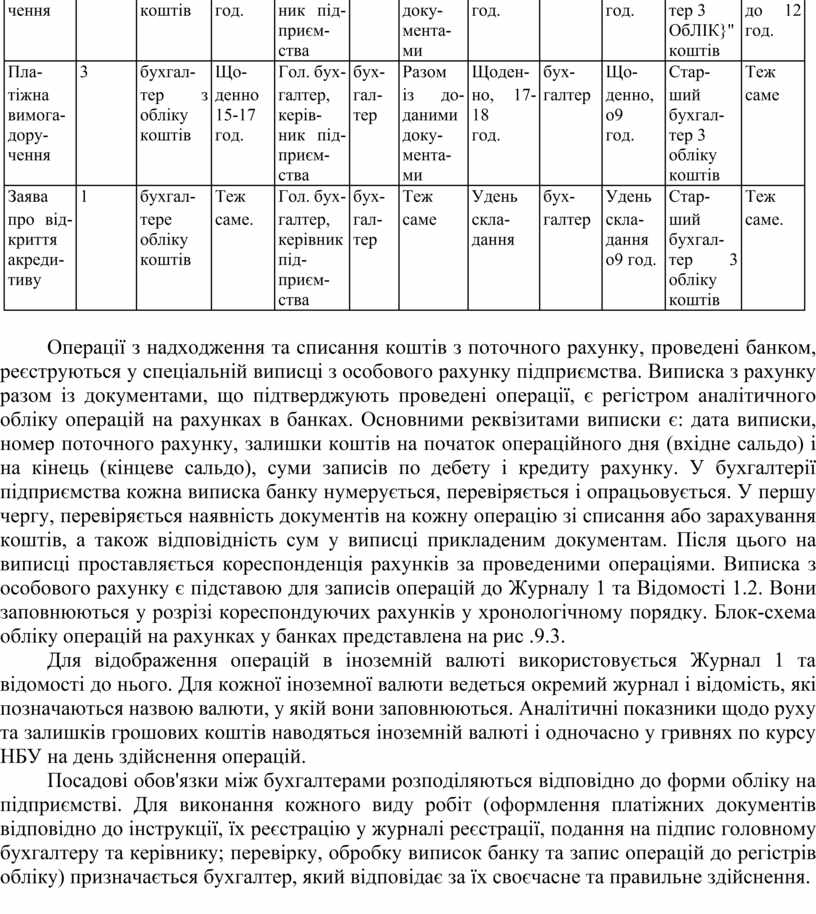 Операції з надходження та списання коштів з поточного рахунку, проведені банком, реєструються у спеціальній виписці з особового рахунку підприємства. Виписка з рахунку разом із документами, що підтверджують проведені операції, є регістром аналітичного обліку операцій на рахунках в банках. Основними реквізитами виписки є: дата виписки, номер поточного рахунку, залишки коштів на початок операційного дня (вхідне сальдо) і на кінець (кінцеве сальдо), суми записів по дебету і кредиту рахунку. У бухгалтерії підприємства кожна виписка банку нумерується, перевіряється і опрацьовується. У першу чергу, перевіряється наявність документів на кожну операцію зі списання або зарахування коштів, а також відповідність сум у виписці прикладеним документам. Після цього на виписці проставляється кореспонденція рахунків за проведеними операціями. Виписка з особового рахунку є підставою для записів операцій до Журналу 1 та Відомості 1.2. Вони заповнюються у розрізі кореспондуючих рахунків у хронологічному порядку. Блок-схема обліку операцій на рахунках у банках представлена на рис .9.3.