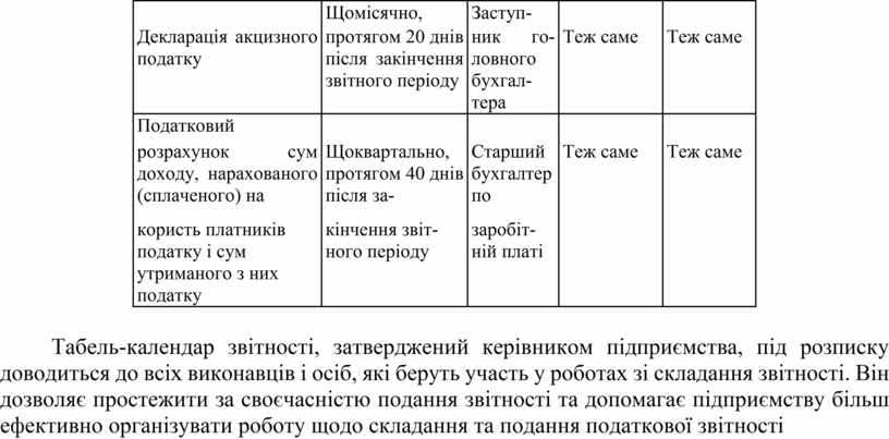 У табелі-календарі податкової звітності вказують назви форм податкової звітності; терміни її подання; осіб, відповідальних за складання кожного звіту; користувачів із зазначенням адрес та способи подання (табл. 6.3).