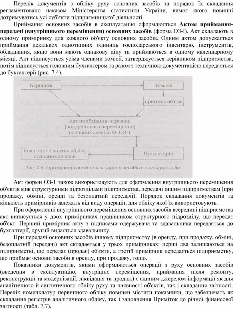 Приймання основних засобів в експлуатацію оформлюється Актом приймання-передачі (внутрішнього переміщення) основних засобів (форма ОЗ-І). Акт складають в одному примірнику для кожного об'єкту основних засобів. Одним актом допускається приймання декількох однотипних одиниць господарського інвентарю, інструментів, обладнання, якщо вони мають однакову ціну та приймаються в одному календарному місяці. Акт підписується усіма членами комісії, затверджується керівником підприємства, потім підписується головним бухгалтером та разом з технічною документацією передається до бухгалтерії (рис. 7.4).