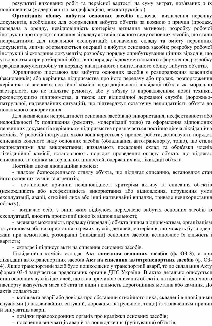 Організація обліку вибуття основних засобів включає: визначення переліку документів, необхідних для оформлення вибуття об'єктів за кожною з причин (продаж, передача в оренду, невідповідність критеріям визнання активом); розробку робочої інструкції про порядок списання зі складу активів кожного виду основних засобів, що стали непридатними для подальшої експлуатації; визначення складу та змісту первинних документів, якими оформлюються операції з вибуття основних засобів; розробку робочої інструкції зі складання документів; розробку порядку оприбуткування цінних відходів, що утворюються при розбиранні об'єктів та порядку їх документального оформлення; розробку графіків документообігу та порядку аналітичного і синтетичного обліку вибуття об'єктів.