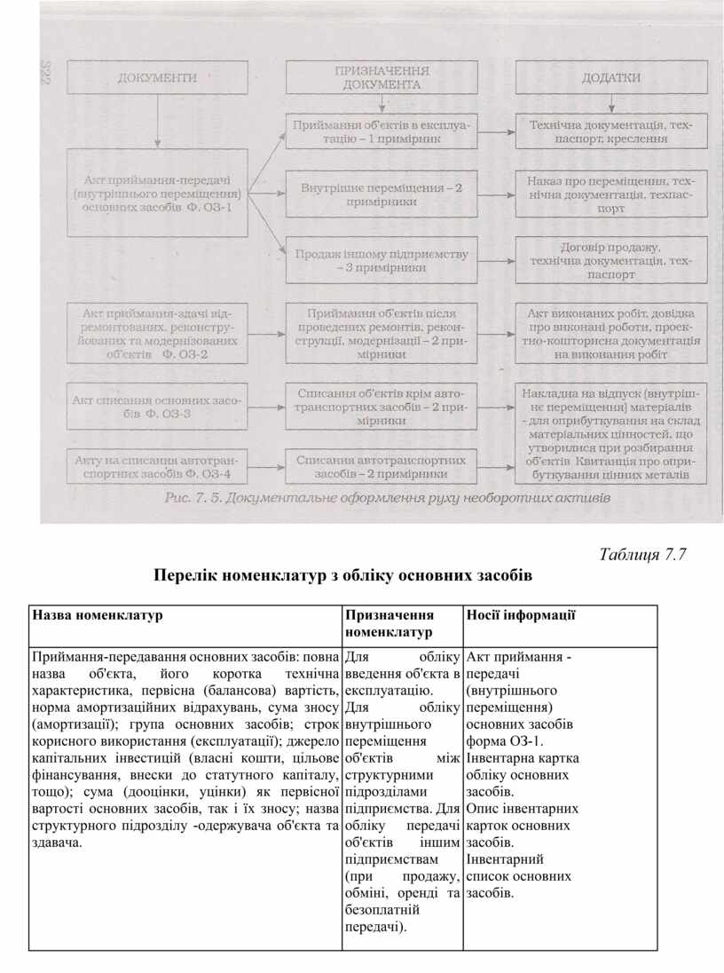 Показники документів, якими оформляються операції з руху основних засобів (введення в експлуатацію, внутрішнє переміщення, приймання після ремонту, реконструкції та модернізації; ліквідація та продаж) є єдиним джерелом інформації як для аналітичного й синтетичного обліку руху та наявності об'єктів, так і складання звітності. Перелік номенклатур первинного обліку повинен містити показники, що забезпечать як складання регістрів аналітичного обліку, так і заповнення Приміток до річної фінансової звітності (табл. 7.7).