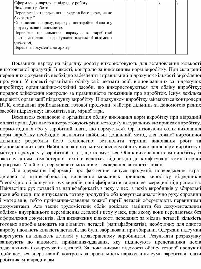 Оформлення наряду на відрядну роботу Виконання роботи Перевірка і затвердження наряду та його передача до бухгалтерії Опрацювання наряду, нарахування заробітної плати у розрахункових відомостях Перевірка правильності нарахування заробітної плати, складання розрахунково-платіжної відомості (зведеної) Передача документа до архіву |
