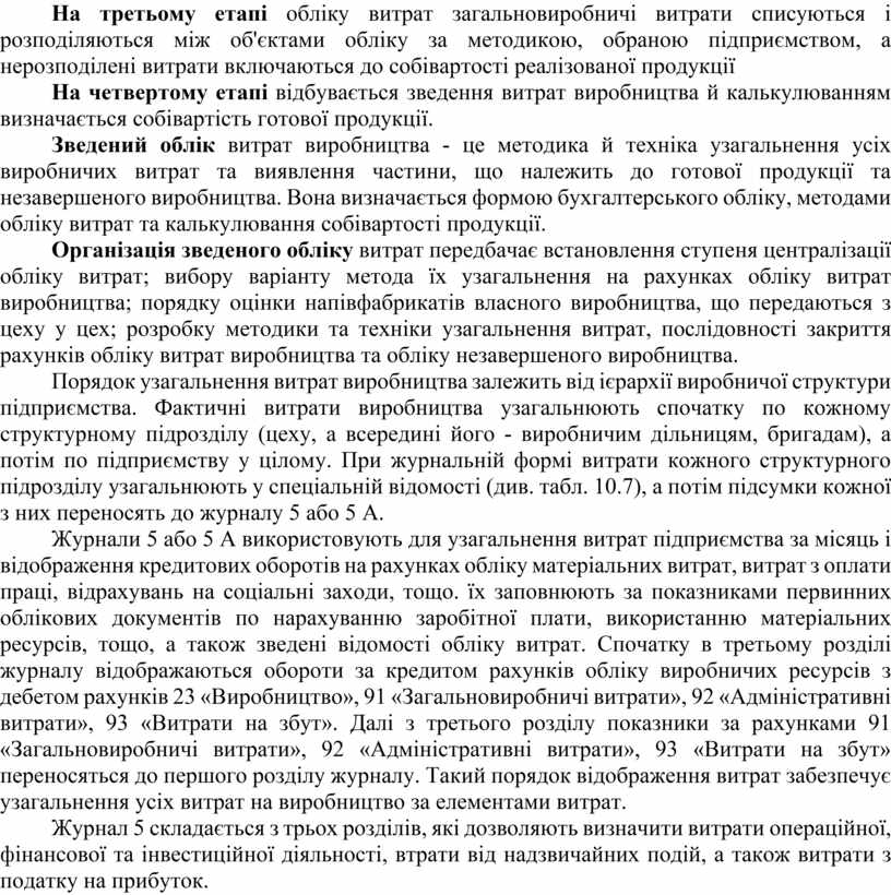 Порядок узагальнення витрат виробництва залежить від ієрархії виробничої структури підприємства. Фактичні витрати виробництва узагальнюють спочатку по кожному структурному підрозділу (цеху, а всередині його - виробничим дільницям, бригадам), а потім по підприємству у цілому. При журнальній формі витрати кожного структурного підрозділу узагальнюють у спеціальній відомості (див. табл. 10.7), а потім підсумки кожної з них переносять до журналу 5 або 5 А.