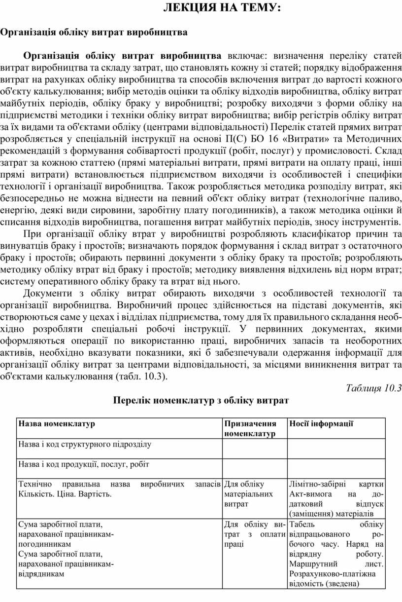 Документи з обліку витрат обирають виходячи з особливостей технології та організації виробництва. Виробничий процес здійснюється на підставі документів, які створюються саме у цехах і відділах підприємства, тому для їх правильного складання необхідно розробляти спеціальні робочі інструкції. У первинних документах, якими оформляються операції по використанню праці, виробничих запасів та необоротних активів, необхідно вказувати показники, які б забезпечували одержання інформації для організації обліку витрат за центрами відповідальності, за місцями виникнення витрат та об'єктами калькулювання (табл. 10.3).