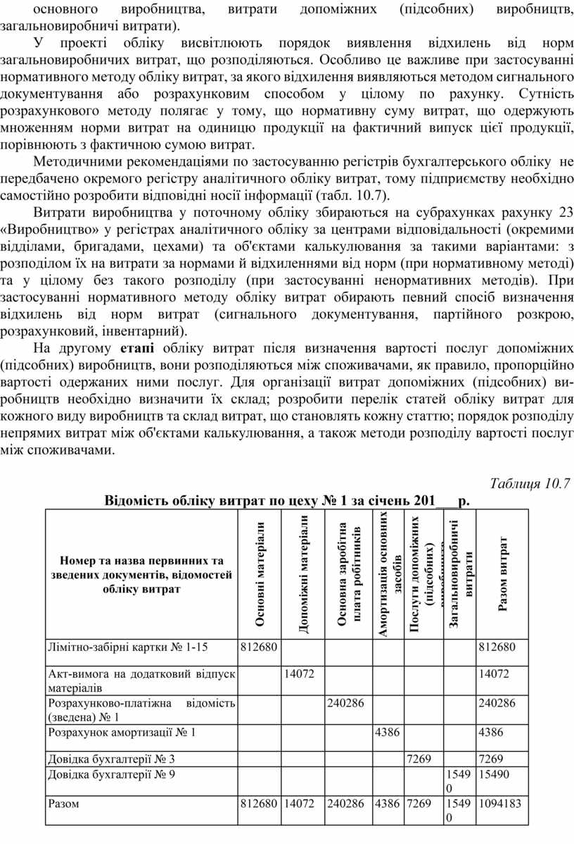 Методичними рекомендаціями по застосуванню регістрів бухгалтерського обліку не передбачено окремого регістру аналітичного обліку витрат, тому підприємству необхідно самостійно розробити відповідні носії інформації (табл. 10.7).