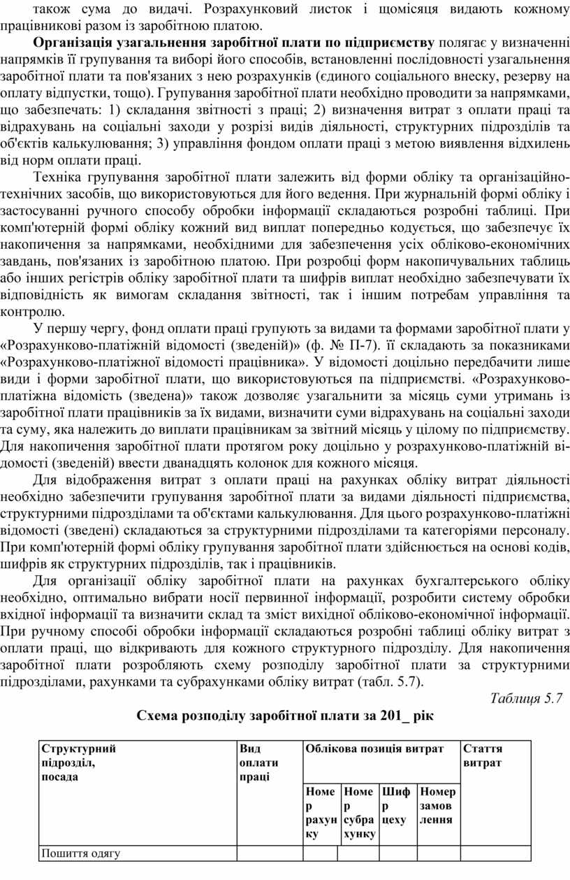 Для організації обліку заробітної плати на рахунках бухгалтерського обліку необхідно, оптимально вибрати носії первинної інформації, розробити систему обробки вхідної інформації та визначити склад та зміст вихідної обліково-економічної інформації. При ручному способі обробки інформації складаються розробні таблиці обліку витрат з оплати праці, що відкривають для кожного структурного підрозділу. Для накопичення заробітної плати розробляють схему розподілу заробітної плати за структурними підрозділами, рахунками та субрахунками обліку витрат (табл. 5.7).