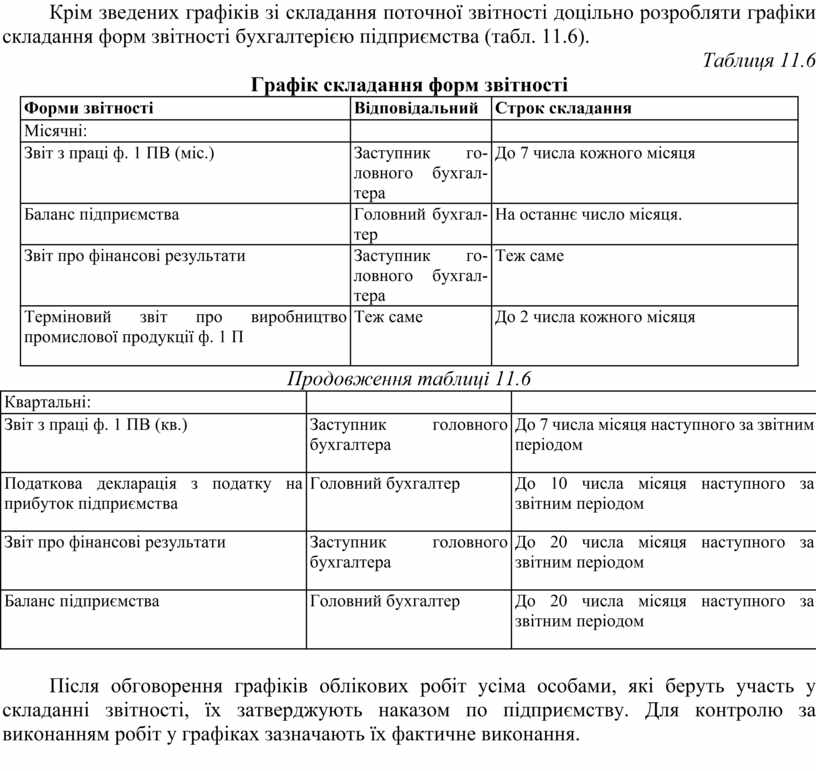 Крім зведених графіків зі складання поточної звітності доцільно розробляти графіки складання форм звітності бухгалтерією підприємства (табл. 11.6).