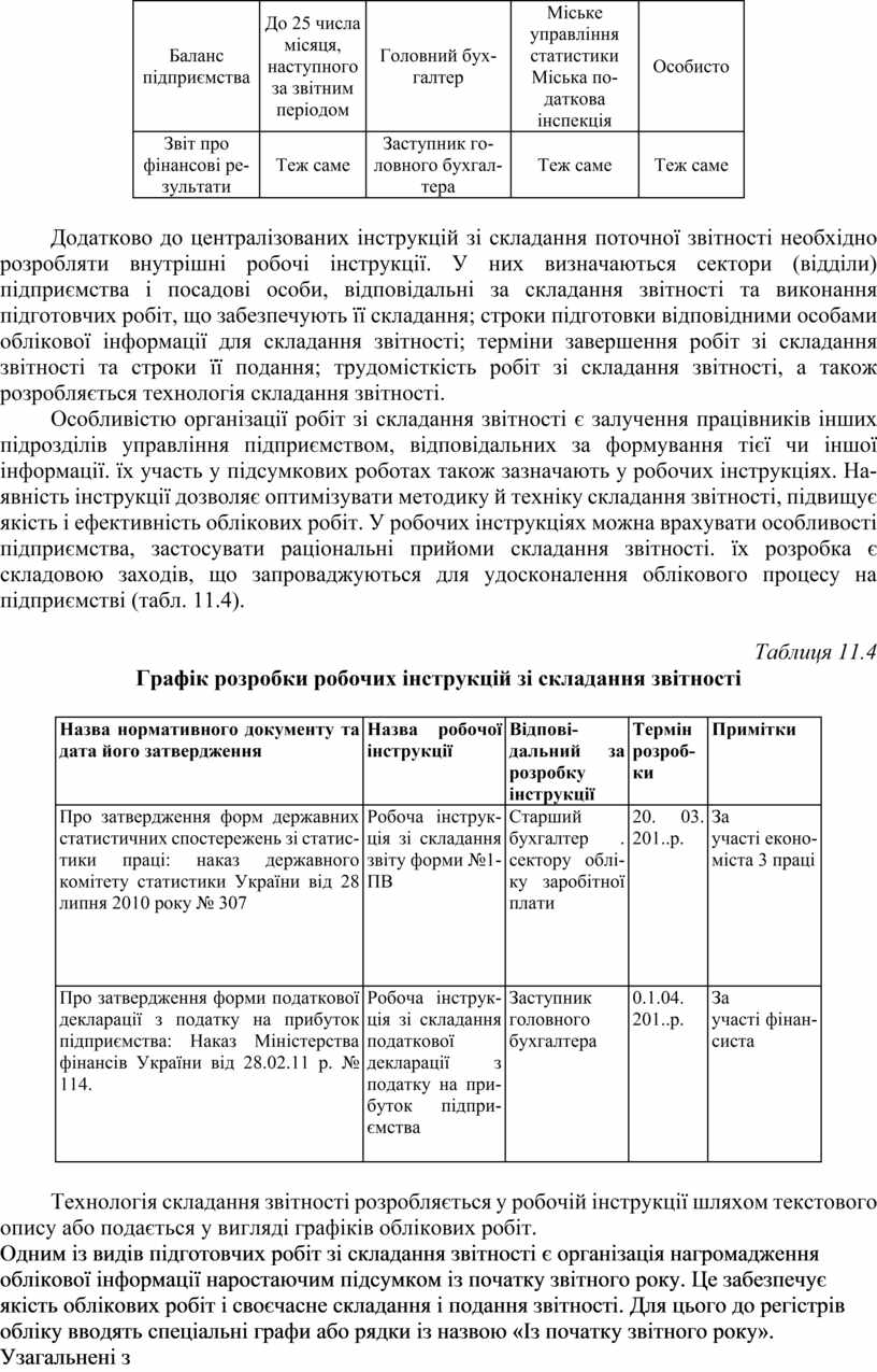 Особливістю організації робіт зі складання звітності є залучення працівників інших підрозділів управління підприємством, відповідальних за формування тієї чи іншої інформації. їх участь у підсумкових роботах також зазначають у робочих інструкціях. Наявність інструкції дозволяє оптимізувати методику й техніку складання звітності, підвищує якість і ефективність облікових робіт. У робочих інструкціях можна врахувати особливості підприємства, застосувати раціональні прийоми складання звітності. їх розробка є складовою заходів, що запроваджуються для удосконалення облікового процесу на підприємстві (табл. 11.4).