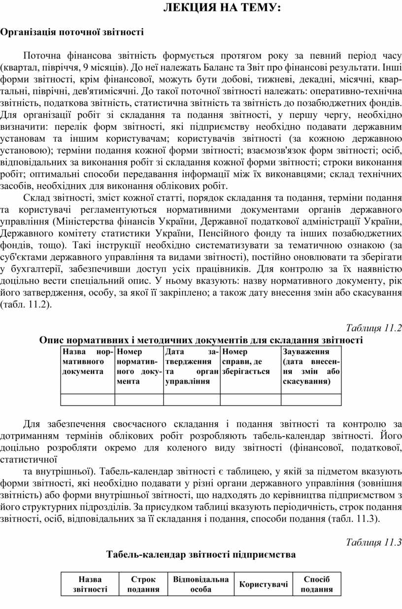 та внутрішньої). Табель-календар звітності є таблицею, у якій за підметом вказують форми звітності, які необхідно подавати у різні органи державного управління (зовнішня звітність) або форми внутрішньої звітності, що надходять до керівництва підприємством з його структурних підрозділів. За присудком таблиці вказують періодичність, строк подання звітності, осіб, відповідальних за її складання і подання, способи подання (табл. 11.3).