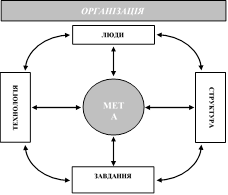 Незалежно від вибору моделі при аналізі організації, як правило, розглядають її внутрішнє та зовнішнє середовища. У своїй сукупності люди, завдання, цілі, технологія, структура є внутрішнім середовищем організації (рис. 4).