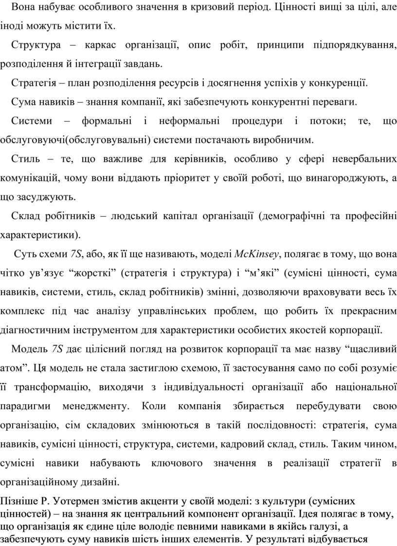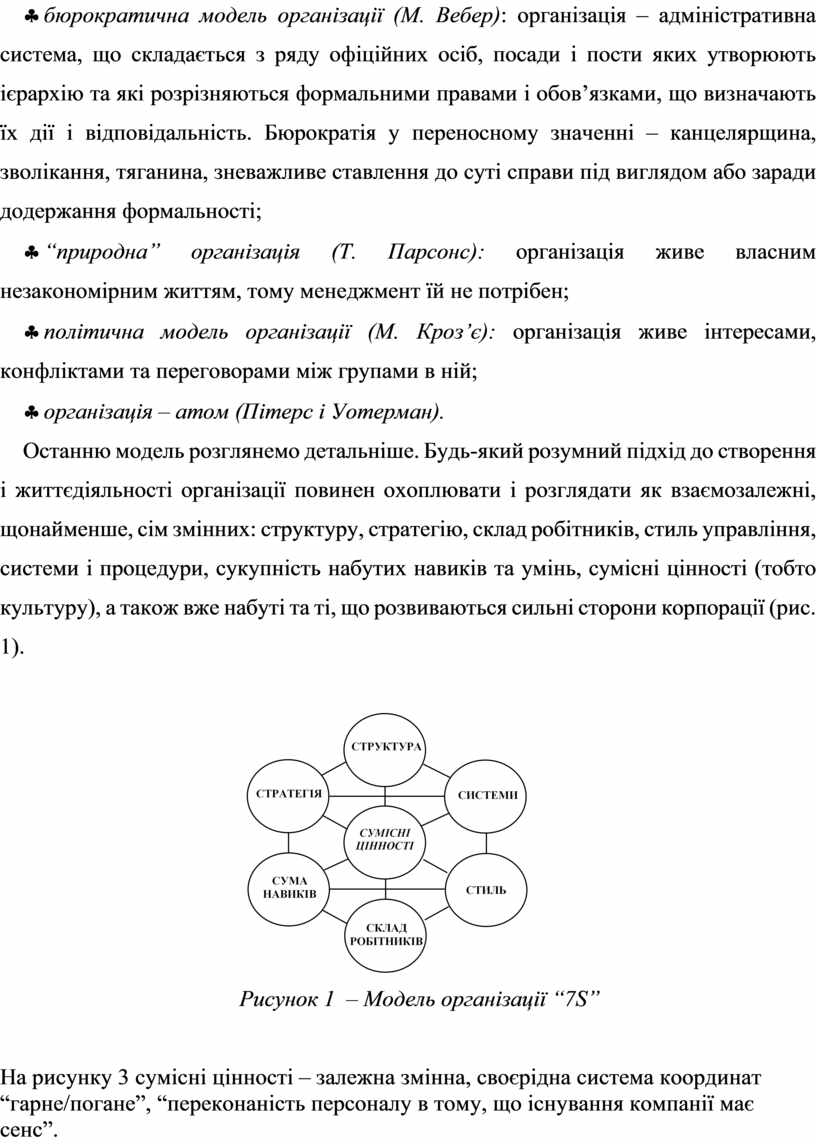 Останню модель розглянемо детальніше. Будь-який розумний підхід до створення і життєдіяльності організації повинен охоплювати і розглядати як взаємозалежні, щонайменше, сім змінних: структуру, стратегію, склад робітників, стиль управління, системи і процедури, сукупність набутих навиків та умінь, сумісні цінності (тобто культуру), а також вже набуті та ті, що розвиваються сильні сторони корпорації (рис. 1).