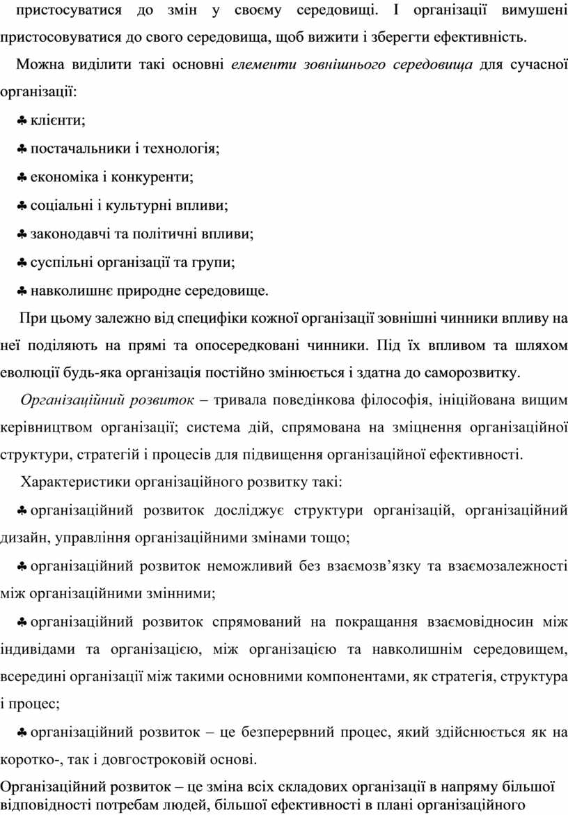 § організаційний розвиток спрямований на покращання взаємовідносин між індивідами та організацією, між організацією та навколишнім середовищем, всередині організації між такими основними компонентами, як стратегія, структура і процес;
