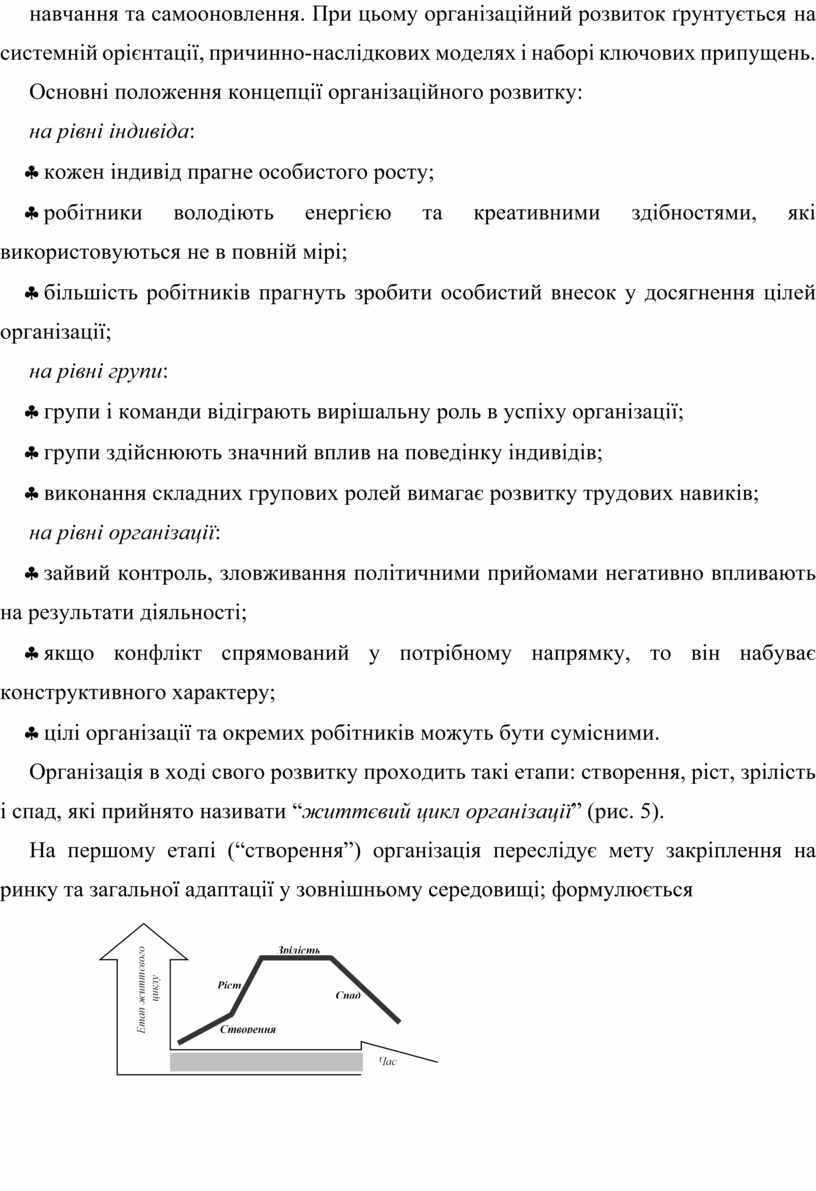 Організація в ході свого розвитку проходить такі етапи: створення, ріст, зрілість і спад, які прийнято називати “життєвий цикл організації” (рис. 5).