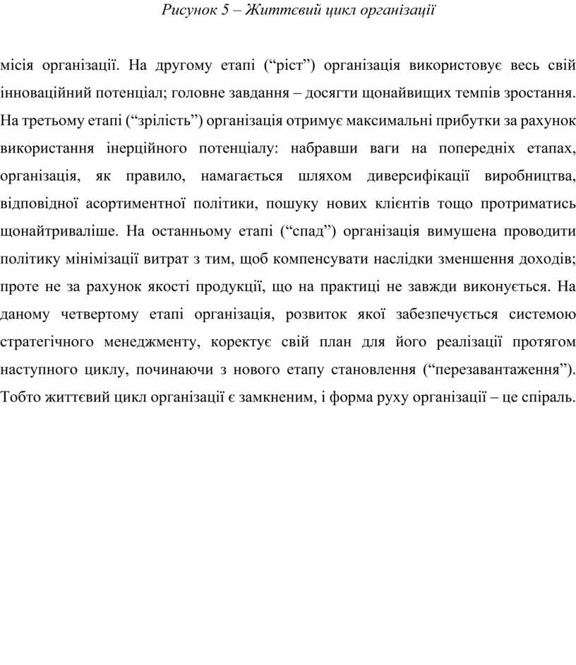 місія організації. На другому етапі (“ріст”) організація використовує весь свій інноваційний потенціал; головне завдання – досягти щонайвищих темпів зростання. На третьому етапі (“зрілість”) організація отримує максимальні прибутки за рахунок використання інерційного потенціалу: набравши ваги на попередніх етапах, організація, як правило, намагається шляхом диверсифікації виробництва, відповідної асортиментної політики, пошуку нових клієнтів тощо протриматись щонайтриваліше. На останньому етапі (“спад”) організація вимушена проводити політику мінімізації витрат з тим, щоб компенсувати наслідки зменшення доходів; проте не за рахунок якості продукції, що на практиці не завжди виконується. На даному четвертому етапі організація, розвиток якої забезпечується системою стратегічного менеджменту, коректує свій план для його реалізації протягом наступного циклу, починаючи з нового етапу становлення (“перезавантаження”). Тобто життєвий цикл організації є замкненим, і форма руху організації – це спіраль.