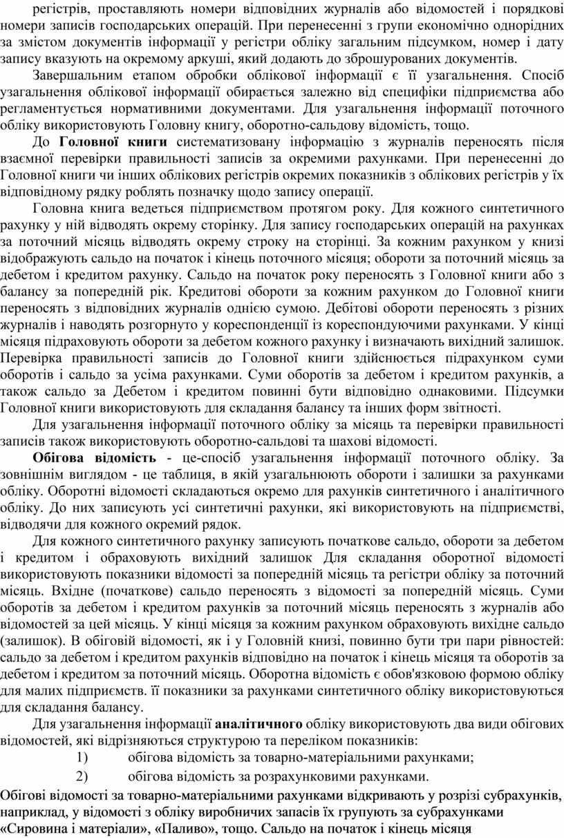 Завершальним етапом обробки облікової інформації є її узагальнення. Спосіб узагальнення облікової інформації обирається залежно від специфіки підприємства або регламентується нормативними документами. Для узагальнення інформації поточного обліку використовують Головну книгу, оборотно-сальдову відомість, тощо.