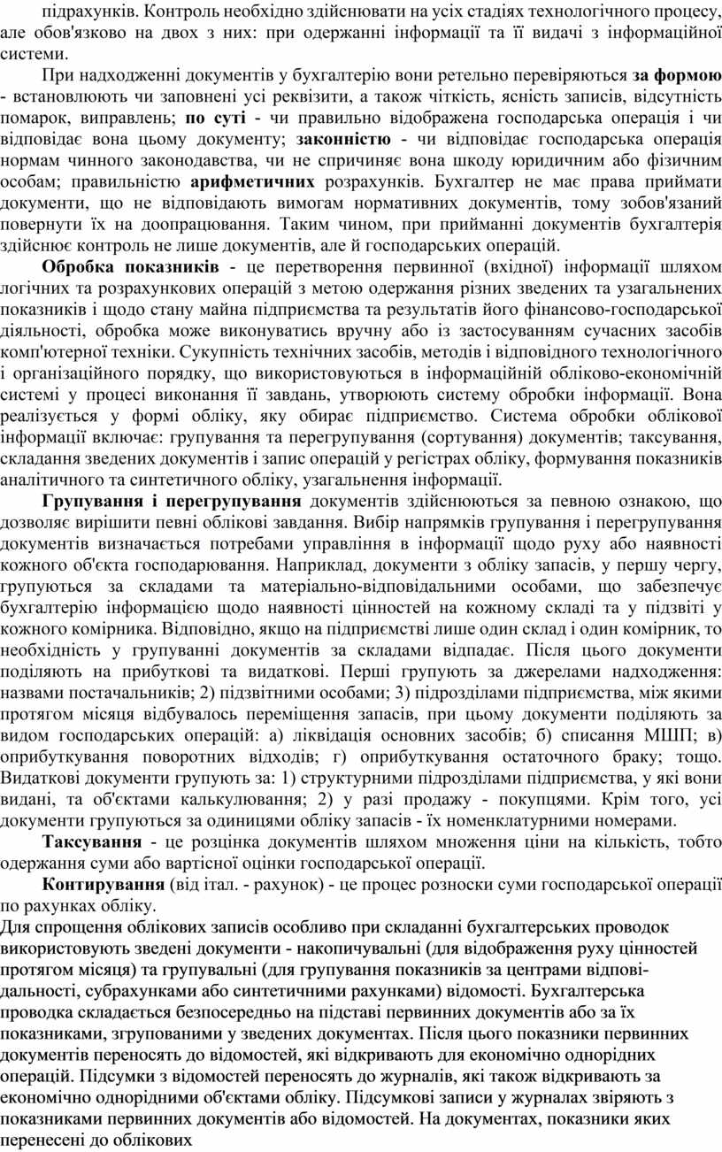 Обробка показників - це перетворення первинної (вхідної) інформації шляхом логічних та розрахункових операцій з метою одержання різних зведених та узагальнених показників і щодо стану майна підприємства та результатів його фінансово-господарської діяльності, обробка може виконуватись вручну або із застосуванням сучасних засобів комп'ютерної техніки. Сукупність технічних засобів, методів і відповідного технологічного і організаційного порядку, що використовуються в інформаційній обліково-економічній системі у процесі виконання її завдань, утворюють систему обробки інформації. Вона реалізується у формі обліку, яку обирає підприємство. Система обробки облікової інформації включає: групування та перегрупування (сортування) документів; таксування, складання зведених документів і запис операцій у регістрах обліку, формування показників аналітичного та синтетичного обліку, узагальнення інформації.