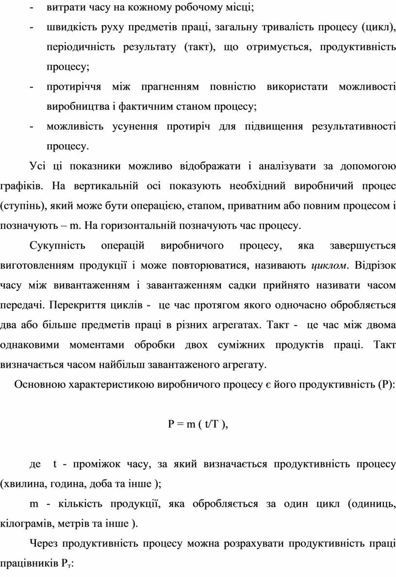 Усі ці показники можливо відображати і аналізувати за допомогою графіків. На вертикальній осі показують необхідний виробничий процес (ступінь), який може бути операцією, етапом, приватним або повним процесом і позначують – m. На горизонтальній позначують час процесу.