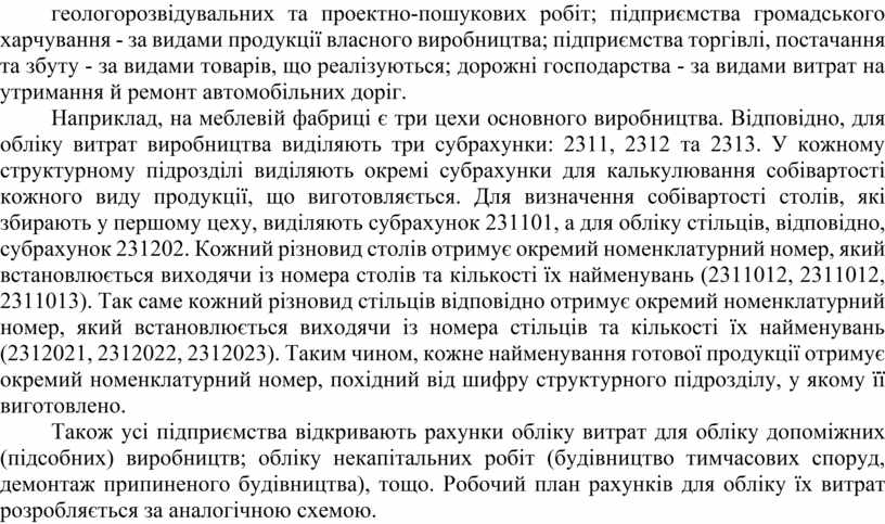 Наприклад, на меблевій фабриці є три цехи основного виробництва. Відповідно, для обліку витрат виробництва виділяють три субрахунки: 2311, 2312 та 2313. У кожному структурному підрозділі виділяють окремі субрахунки для калькулювання собівартості кожного виду продукції, що виготовляється. Для визначення собівартості столів, які збирають у першому цеху, виділяють субрахунок 231101, а для обліку стільців, відповідно, субрахунок 231202. Кожний різновид столів отримує окремий номенклатурний номер, який встановлюється виходячи із номера столів та кількості їх найменувань (2311012, 2311012, 2311013). Так саме кожний різновид стільців відповідно отримує окремий номенклатурний номер, який встановлюється виходячи із номера стільців та кількості їх найменувань (2312021, 2312022, 2312023). Таким чином, кожне найменування готової продукції отримує окремий номенклатурний номер, похідний від шифру структурного підрозділу, у якому її виготовлено.