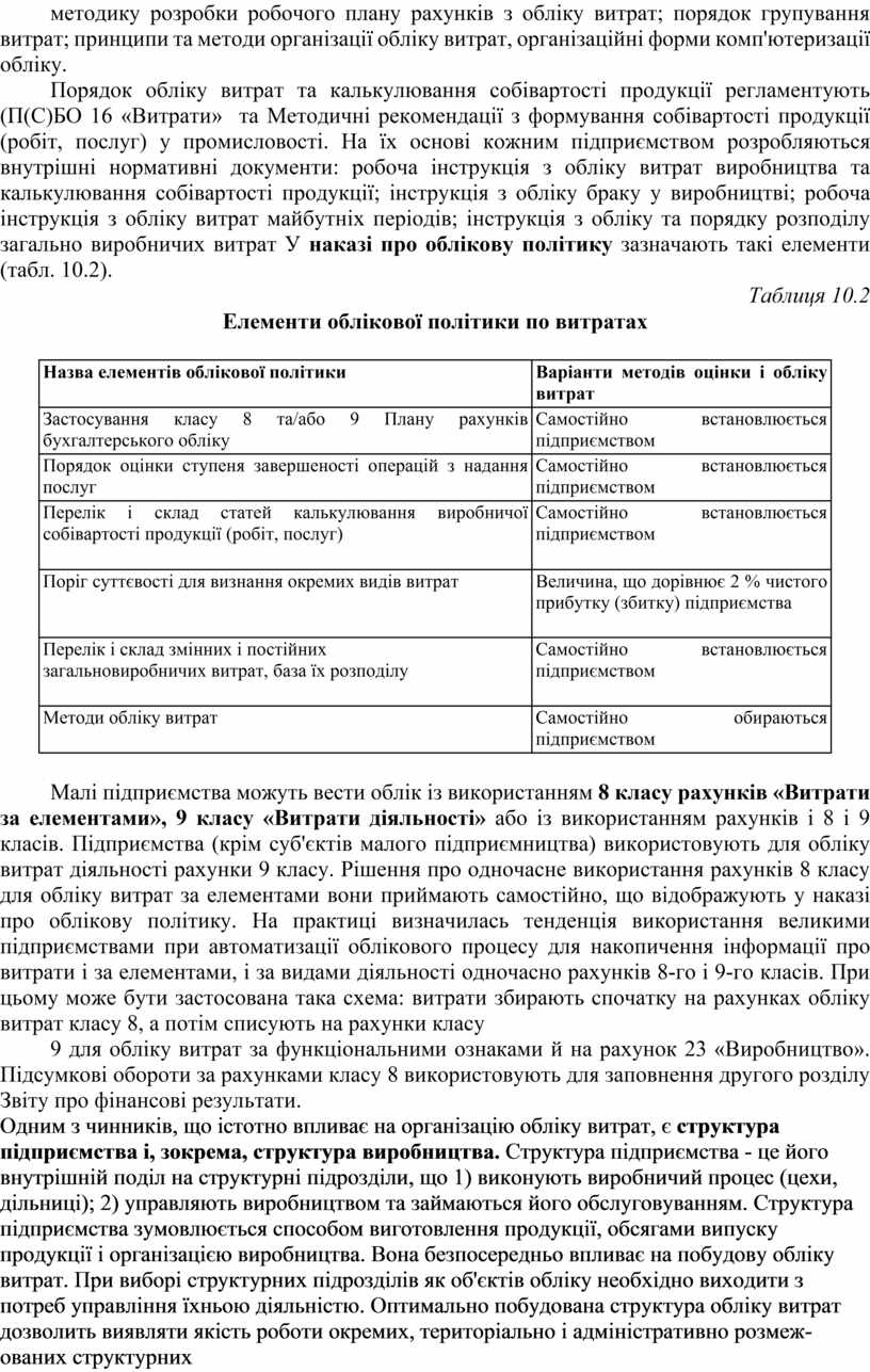Порядок обліку витрат та калькулювання собівартості продукції регламентують (П(С)БО 16 «Витрати» та Методичні рекомендації з формування собівартості продукції (робіт, послуг) у промисловості. На їх основі кожним підприємством розробляються внутрішні нормативні документи: робоча інструкція з обліку витрат виробництва та калькулювання собівартості продукції; інструкція з обліку браку у виробництві; робоча інструкція з обліку витрат майбутніх періодів; інструкція з обліку та порядку розподілу загально виробничих витрат У наказі про облікову політику зазначають такі елементи (табл. 10.2).