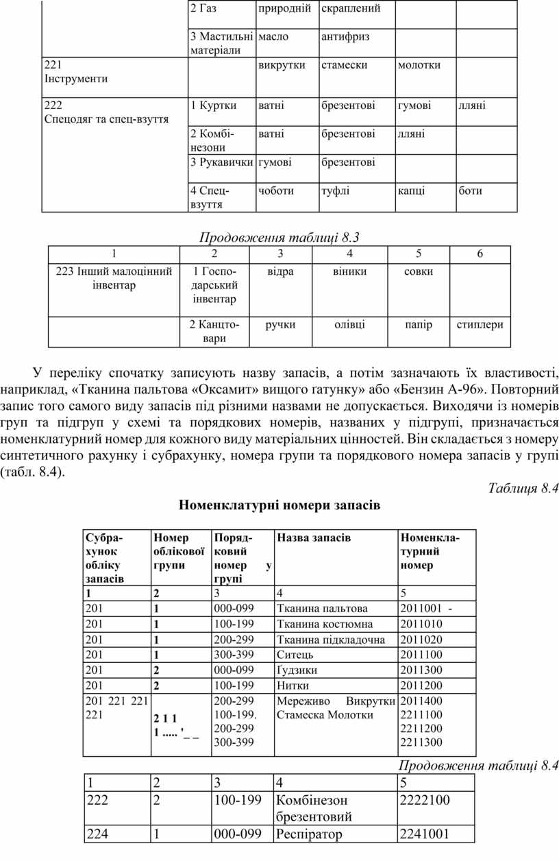 У переліку спочатку записують назву запасів, а потім зазначають їх властивості, наприклад, «Тканина пальтова «Оксамит» вищого ґатунку» або «Бензин А-96». Повторний запис того самого виду запасів під різними назвами не допускається. Виходячи із номерів груп та підгруп у схемі та порядкових номерів, названих у підгрупі, призначається номенклатурний номер для кожного виду матеріальних цінностей. Він складається з номеру синтетичного рахунку і субрахунку, номера групи та порядкового номера запасів у групі (табл. 8.4).