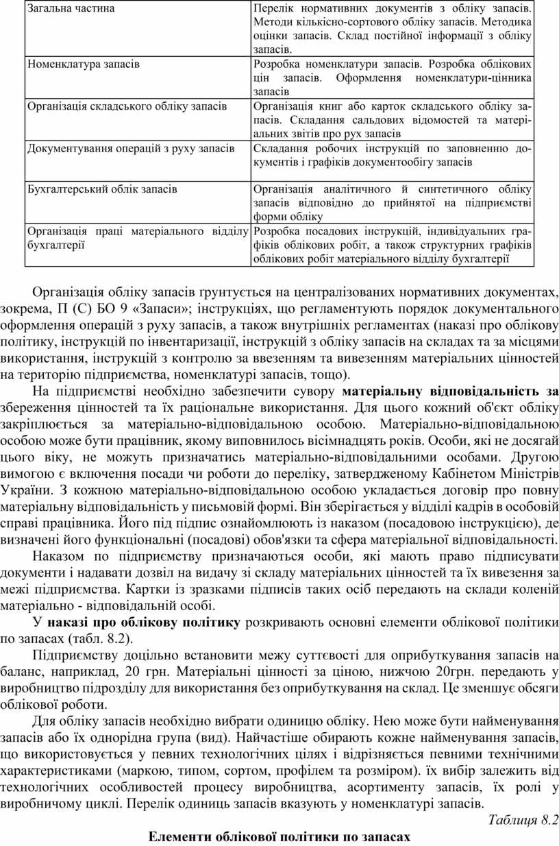 Для організації обліку запасів розробляється проект, який регламентує конкретизує засади обліку у певних умовах функціонування підприємства (табл. 8.1).