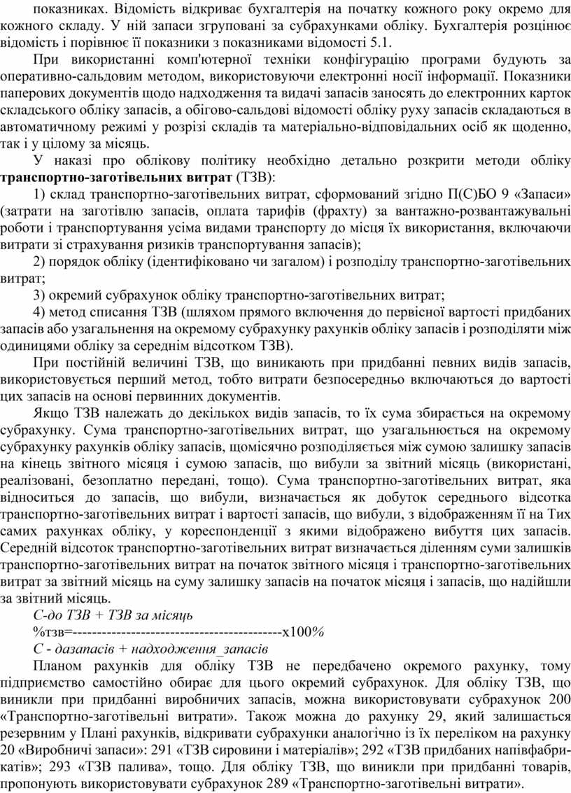 4) метод списання ТЗВ (шляхом прямого включення до первісної вартості придбаних запасів або узагальнення на окремому субрахунку рахунків обліку запасів і розподіляти між одиницями обліку за середнім відсотком ТЗВ).