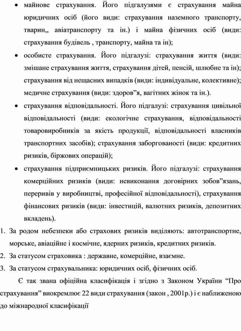 Є так звана офіційна класифікація і згідно з Законом України “Про страхування” виокремлює 22 види страхування (закон , 2001р.) і є наближеною до міжнародної класифікації