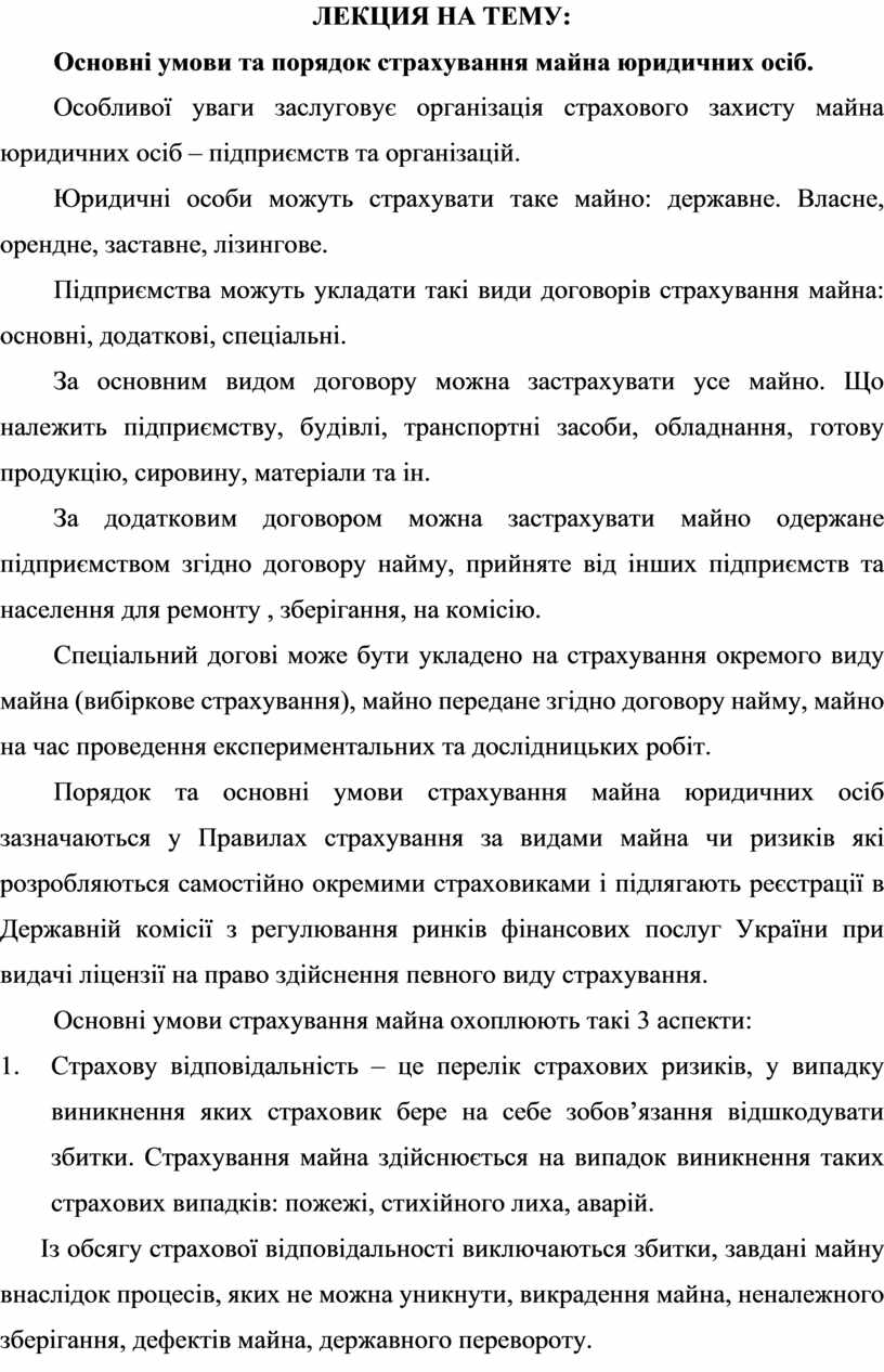 1. Страхову відповідальність – це перелік страхових ризиків, у випадку виникнення яких страховик бере на себе зобов’язання відшкодувати збитки. Страхування майна здійснюється на випадок виникнення таких страхових випадків: пожежі, стихійного лиха, аварій.