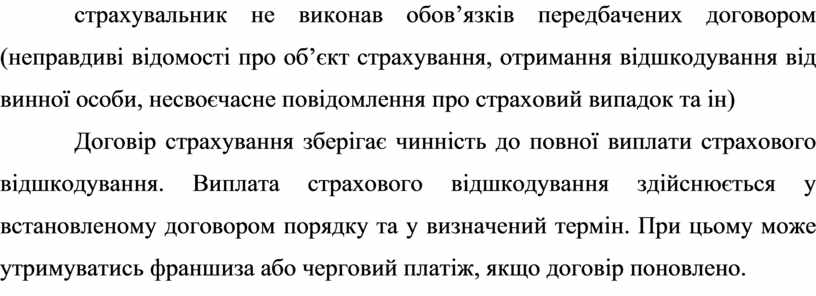 Договір страхування зберігає чинність до повної виплати страхового відшкодування. Виплата страхового відшкодування здійснюється у встановленому договором порядку та у визначений термін. При цьому може утримуватись франшиза або черговий платіж, якщо договір поновлено.