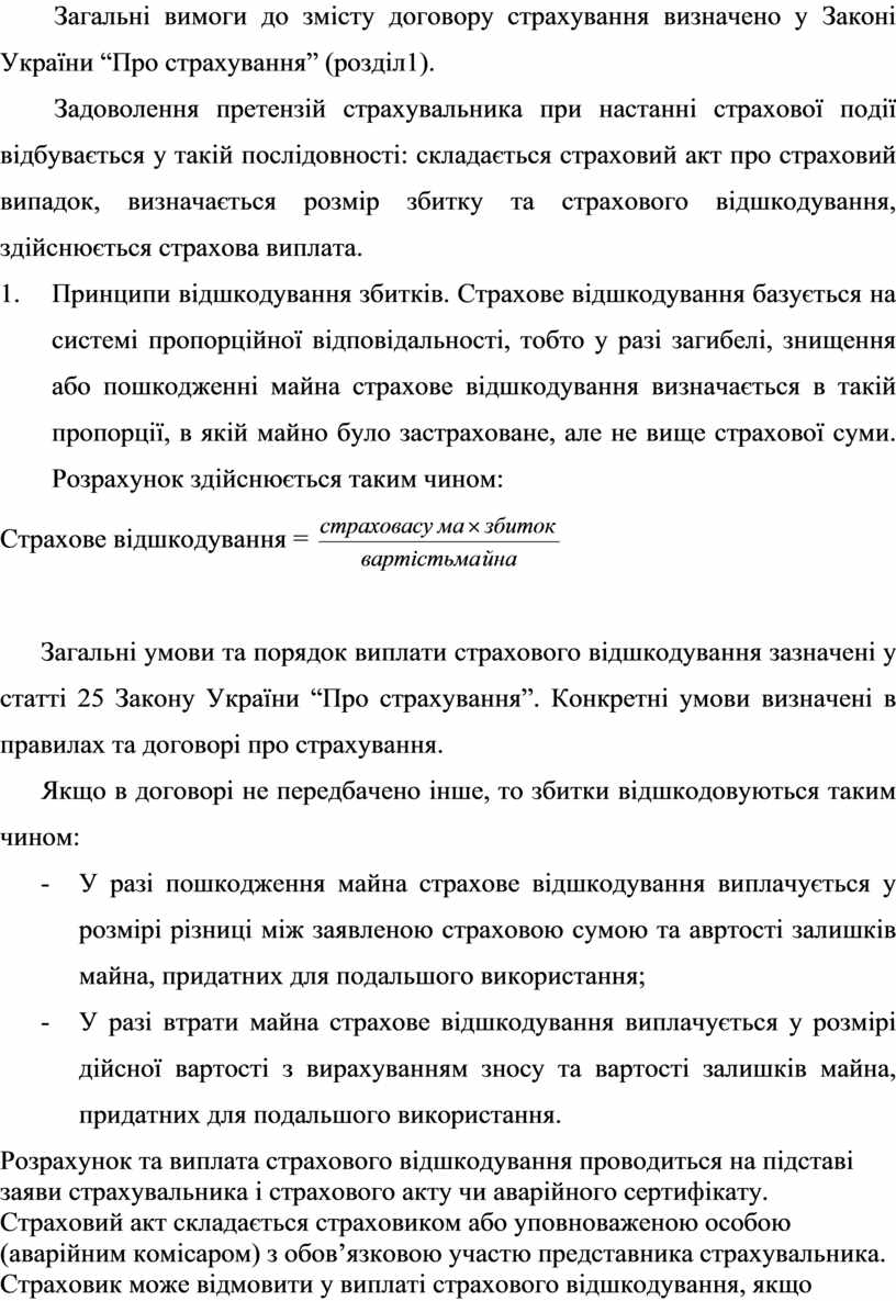 3. Принципи відшкодування збитків. Страхове відшкодування базується на системі пропорційної відповідальності, тобто у разі загибелі, знищення або пошкодженні майна страхове відшкодування визначається в такій пропорції, в якій майно було застраховане, але не вище страхової суми. Розрахунок здійснюється таким чином: