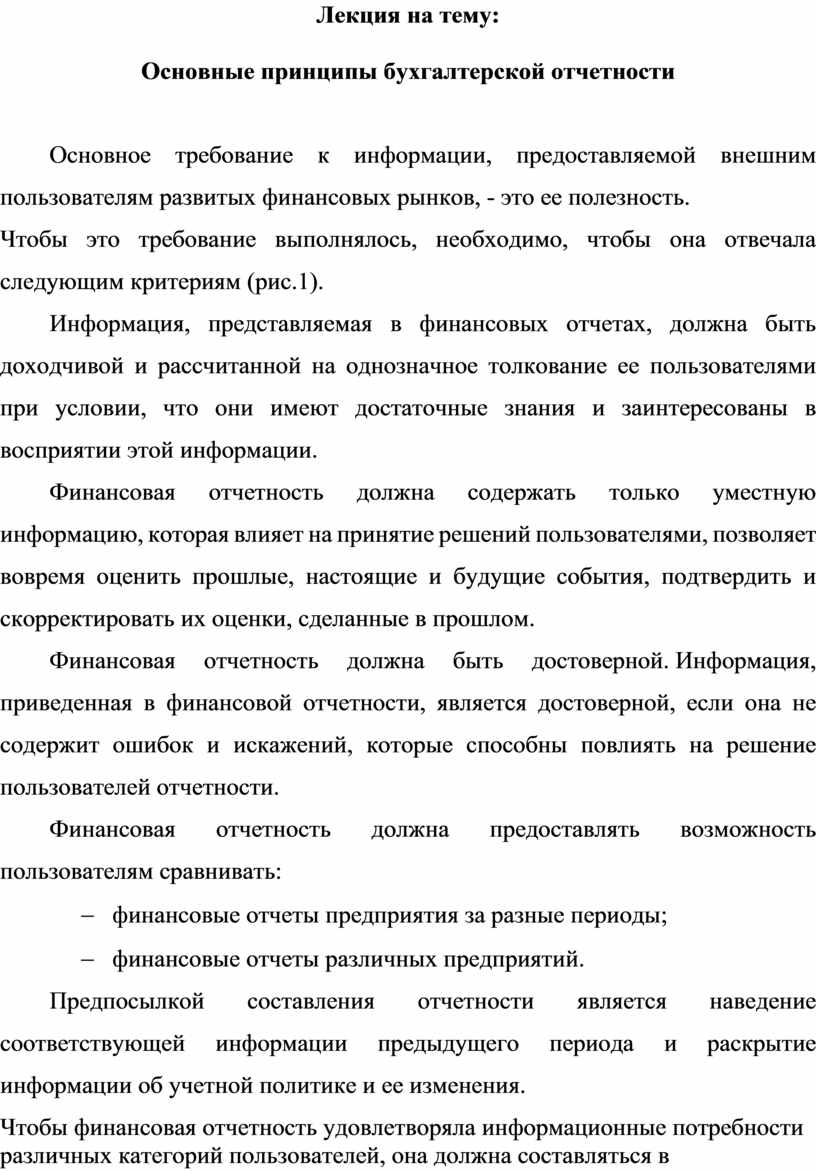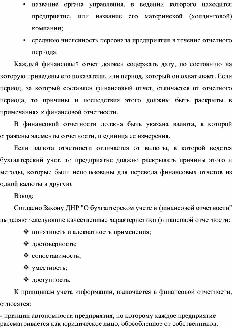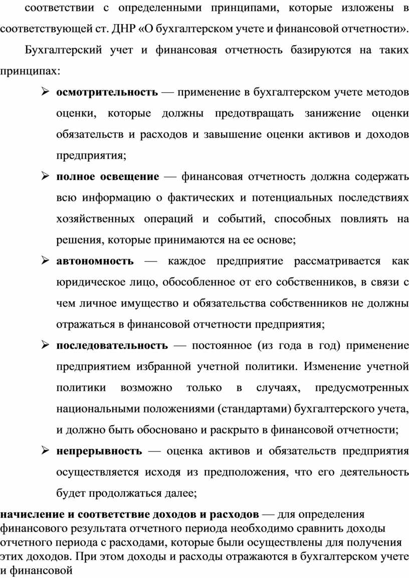 Чтобы финансовая отчетность удовлетворяла информационные потребности различных категорий пользователей, она должна составляться в соответствии с определенными принципами, которые изложены в соответствующей ст. ДНР «О бухгалтерском учете и финансовой отчетности».