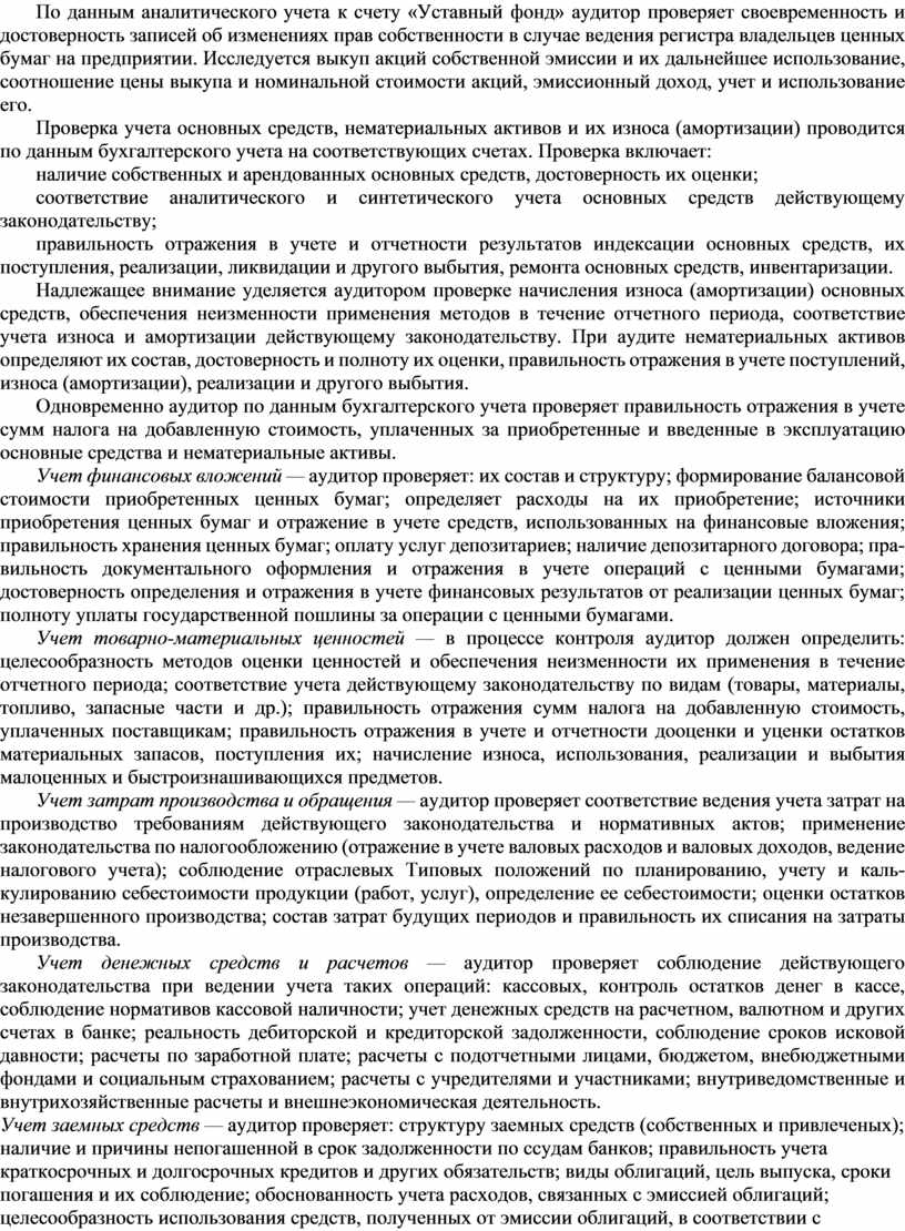 Учет финансовых вложений — аудитор проверяет: их состав и структуру; формирование балансовой стоимости приобретенных ценных бумаг; определяет расходы на их приобретение; источники приобретения ценных бумаг и отражение в учете средств, использованных на финансовые вложения; правильность хранения ценных бумаг; оплату услуг депозитариев; наличие депозитарного договора; правильность документального оформления и отражения в учете операций с ценными бумагами; достоверность определения и отражения в учете финансовых результатов от реализации ценных бумаг; полноту уплаты государственной пошлины за операции с ценными бумагами.
