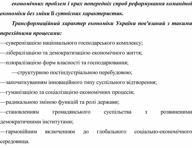 Найважливішою ознакою вітчизняної економіки є її трансформаційний характер, пов'язаний з якісними перетвореннями основоположних засад суспільного життя.