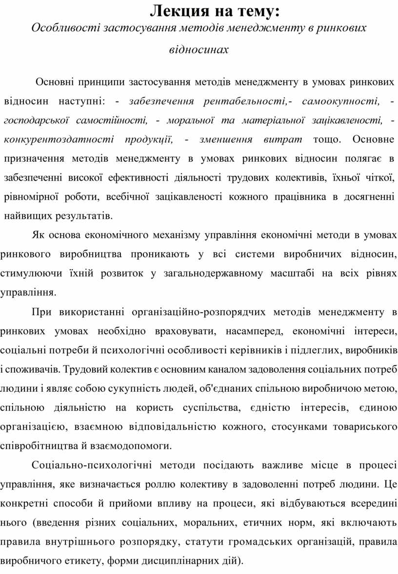 Як основа економічного механізму управління економічні методи в умовах ринкового виробництва проникають у всі системи виробничих відносин, стимулюючи їхній розвиток у загальнодержавному масштабі на всіх рівнях управління.