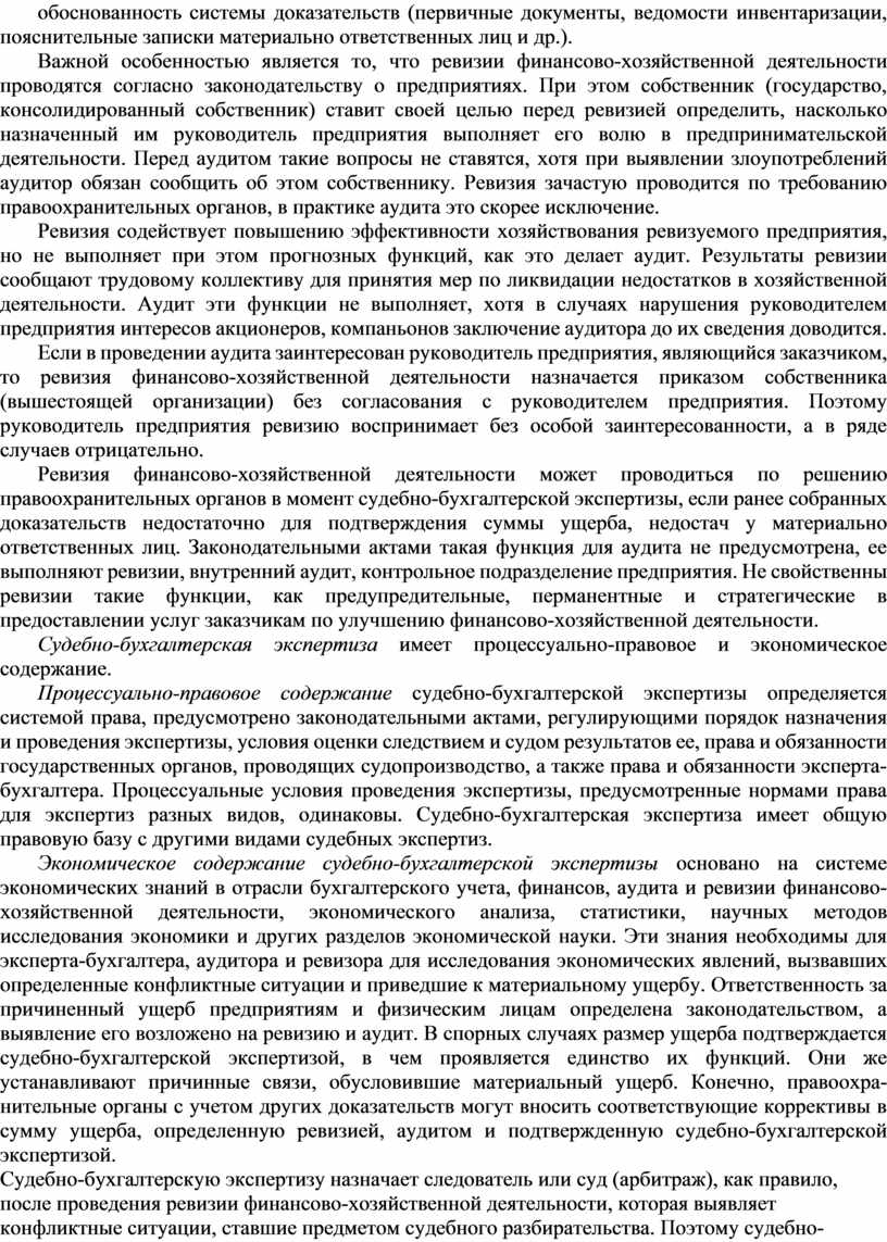 Существенные различия между аудитом, судебно-бухгалтерской экспертизой и ревизией финансово-хозяйственной деятельности обусловлены юридической природой, их целями и задачами, решаемыми ими. Если ревизия исследует комплексно финансово-хозяйственную деятельность предприятия с целью дальнейшего совершенствования ее, то судебно-бухгалтерская экспертиза изучает отдельные недостатки, выявленные ревизией, для документального обоснования исковых требований, предъявленных в следственные или судебные органы к конкретным материально ответственным и другим должностным лицам. Аудит исследует только те вопросы, которые поставлены на его решение по договору с заказчиком, или предусмотренные законодательством (подтверждение правильности данных, содержащихся в балансе и финансовой отчетности).