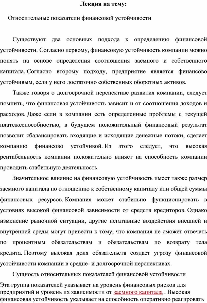 Существуют два основных подхода к определению финансовой устойчивости. Согласно первому, финансовую устойчивость компании можно понять на основе определения соотношения заемного и собственного капитала. Согласно второму подходу, предприятие является финансово устойчивым, если у него достаточно собственных оборотных активов.
