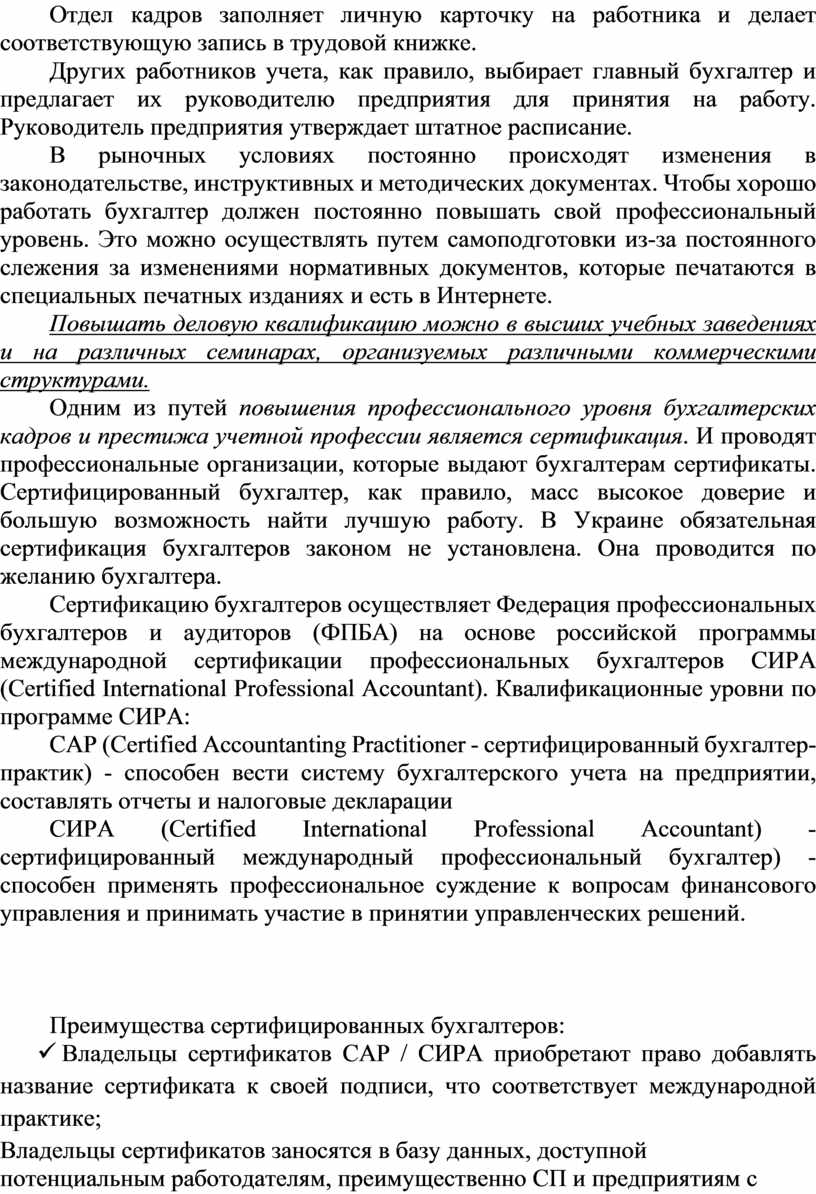 В рыночных условиях кадры решают все. Высококвалифицированный бухгалтер способствует улучшению работы предприятия. Неквалифицированный бухгалтер наносит ей ущерб. Современный бухгалтер не только ведет учет, но и осуществляет контроль и анализ деятельности предприятия, участвует в планировании и управлении. Для успешного выполнения своих обязанностей бухгалтер должен иметь соответствующие знания, навыки и умения. Они приобретаются в результате получения образования и практической работы. Умение - это способность выполнять свои обязанности в конкретных условиях деятельности предприятия.