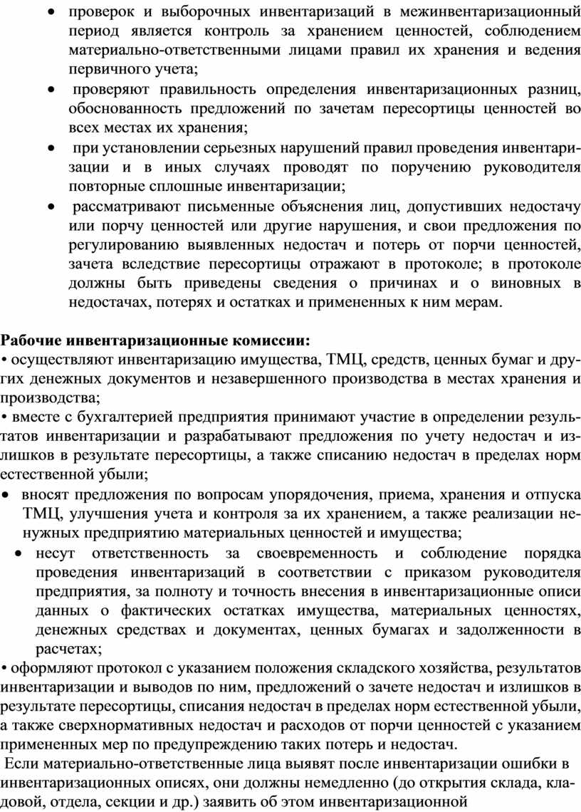 · осуществляют контрольные проверки правильности проведения инвентаризаций, а также выборочные инвентаризации ТМЦ в местах хранения и переработки в межинвентаризационный период; основной задачей проверок и выборочных инвентаризаций в межинвентаризационный период является контроль за хранением ценностей, соблюдением материально-ответственными лицами правил их хранения и ведения первичного учета;
