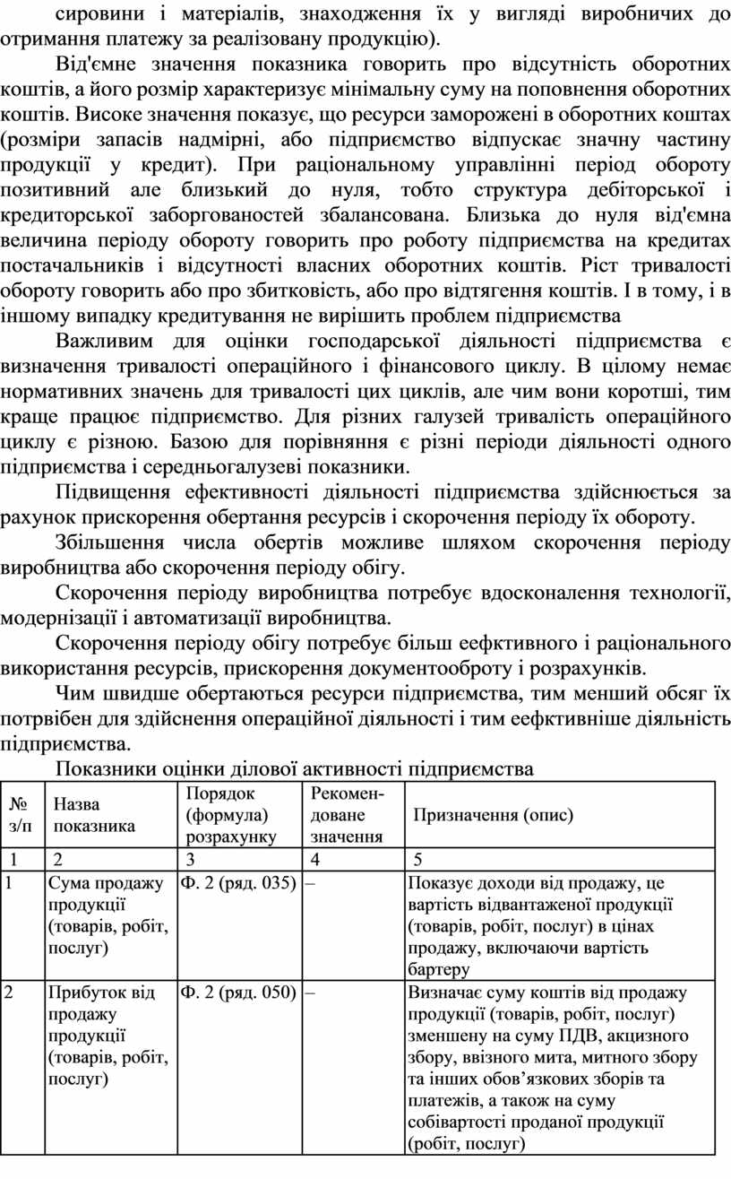 Аналіз ділової активності підприємства здійснюється шляхом розрахунку таких основних показників (коефіцієнтів):