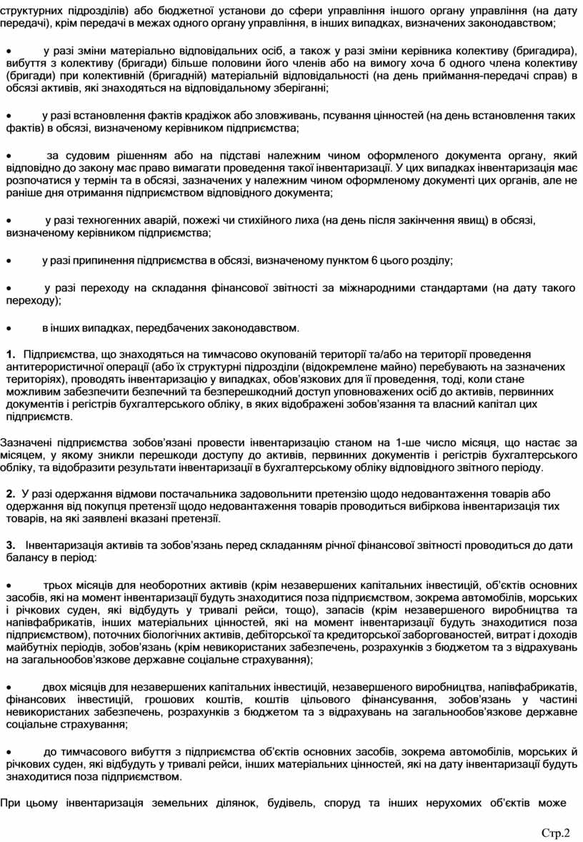 8. Підприємства, що знаходяться на тимчасово окупованій території та/або на території проведення антитерористичної операції (або їх структурні підрозділи (відокремлене майно) перебувають на зазначених територіях), проводять інвентаризацію у випадках, обов’язкових для її проведення, тоді, коли стане можливим забезпечити безпечний та безперешкодний доступ уповноважених осіб до активів, первинних документів і регістрів бухгалтерського обліку, в яких відображені зобов’язання та власний капітал цих підприємств.
