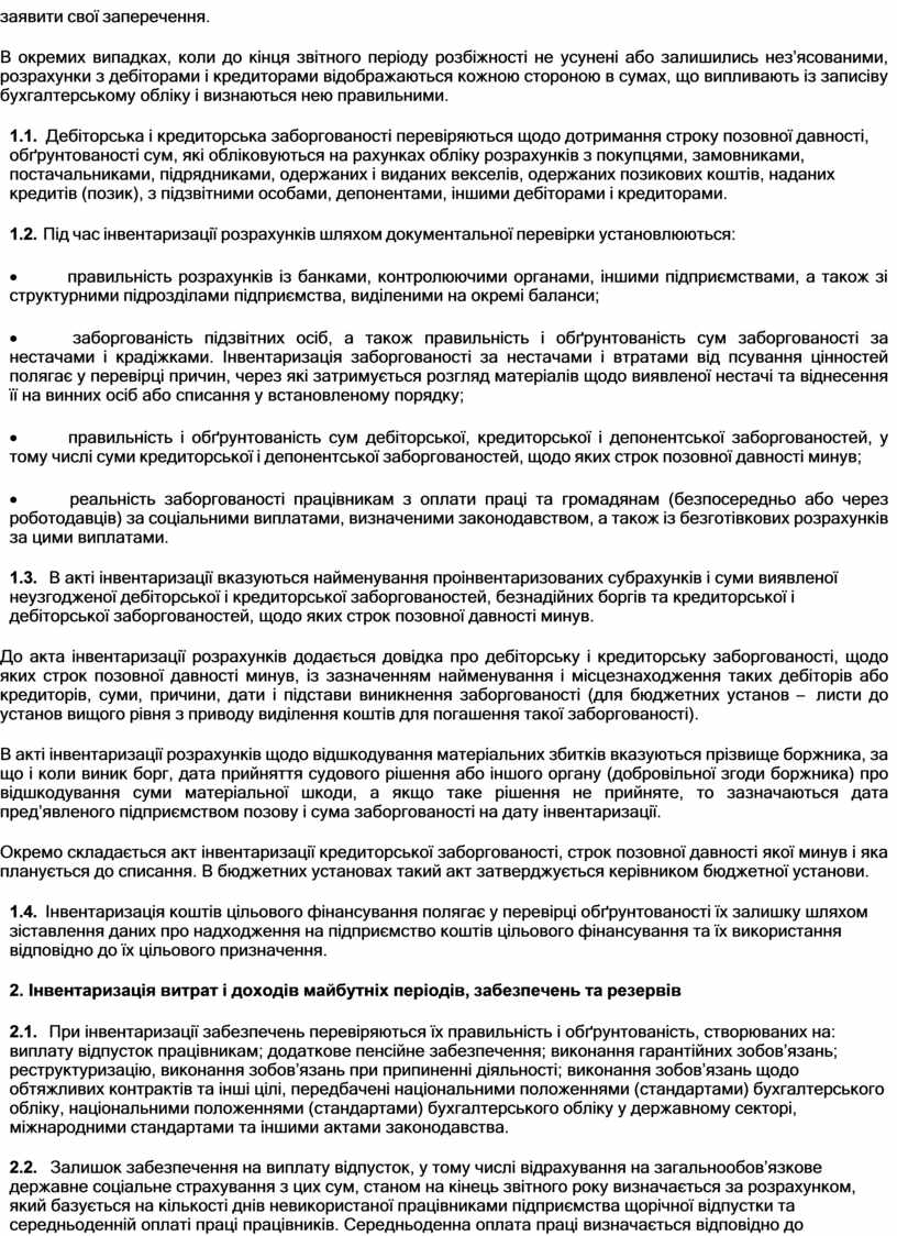 8.1. При інвентаризації забезпечень перевіряються їх правильність і обґрунтованість, створюваних на: виплату відпусток працівникам; додаткове пенсійне забезпечення; виконання гарантійних зобов’язань; реструктуризацію, виконання зобов’язань при припиненні діяльності; виконання зобов’язань щодо обтяжливих контрактів та інші цілі, передбачені національними положеннями (стандартами) бухгалтерського обліку, національними положеннями (стандартами) бухгалтерського обліку у державному секторі, міжнародними стандартами та іншими актами законодавства.