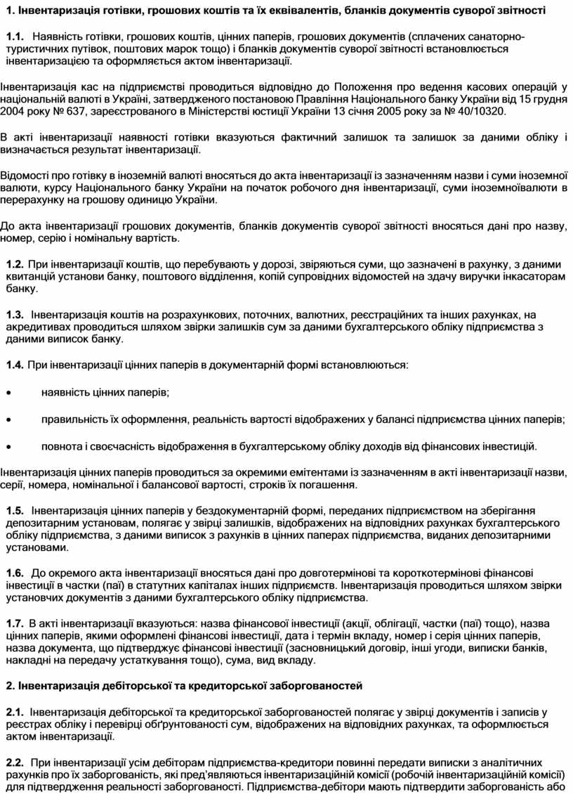 6.1. Наявність готівки, грошових коштів, цінних паперів, грошових документів (сплачених санаторно- туристичних путівок, поштових марок тощо) і бланків документів суворої звітності встановлюється інвентаризацією та оформляється актом інвентаризації.